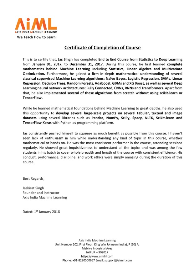Axis India Machine Learning (AIML) was founded to teach and train not only to make someone a capable professional but to make a forever lasting impact in the personality of someone. We at AIML are trying our best to also teach that how to learn any skill which involves STEM. Our teaching methodology strongly relies on combining old school with new methods of teaching. We are on a mission to make people realize that how mathematics and computer programming is driving everything, importance of learning anything in a detailed manner and making highly trained world class researchers and professionals out of amateurs.